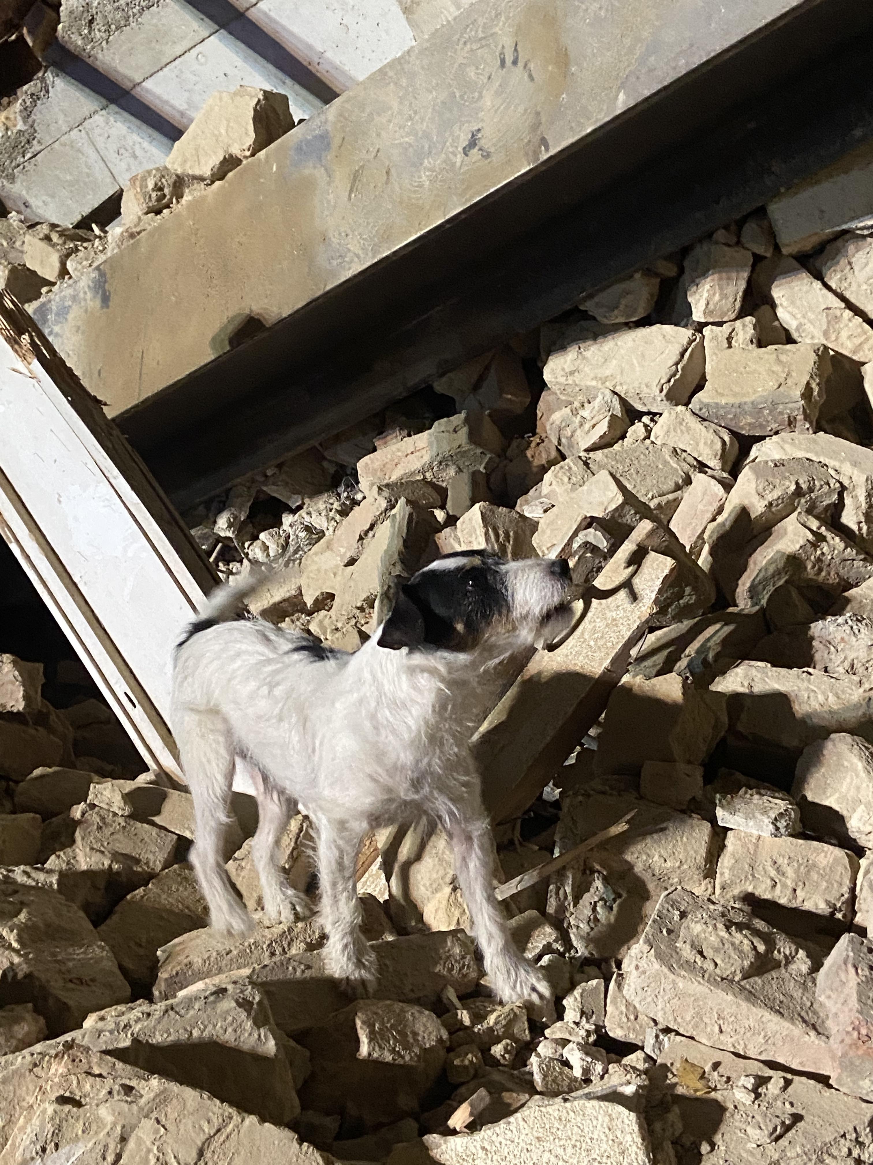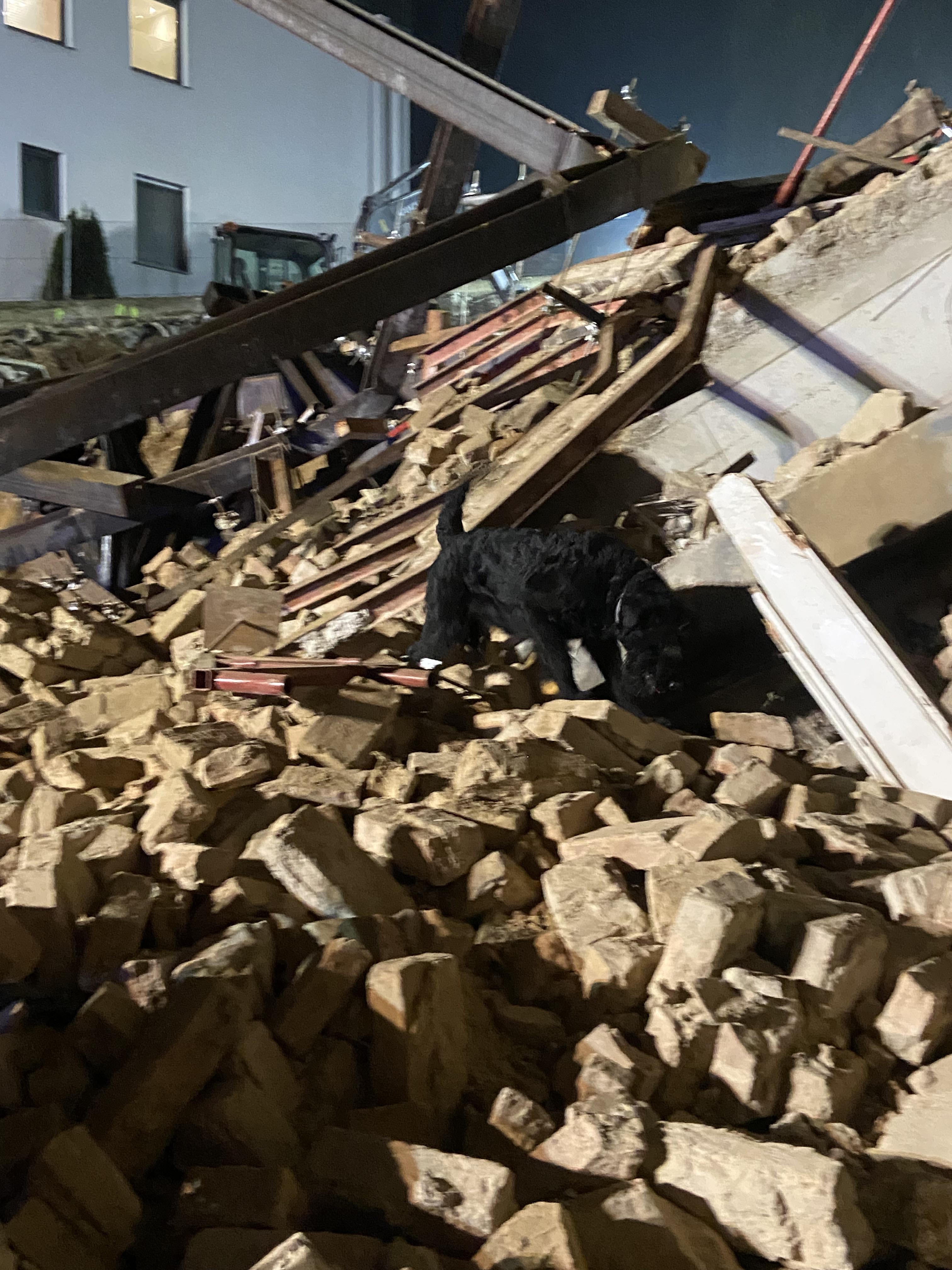 Search and rescue dogs from our member organisation, Feuerwehr Wien Rettungshunde, were deployed to examine the site. Exposed steel beams and unstable debris made the area challenging to navigate. Arvi and Flori, the two search dogs on duty, moved confidently across the rubble and checked every accessible section with calm, steady focus. Their search revealed no signs of trapped persons.